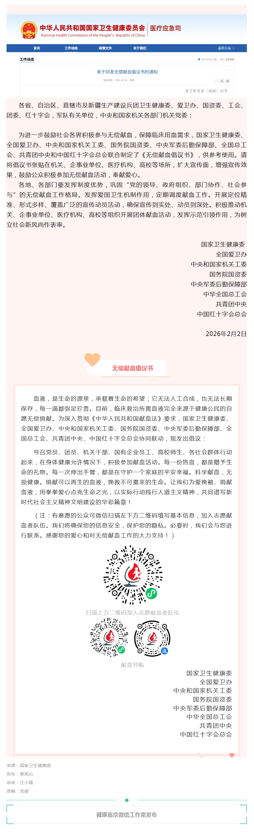 国家卫健委等八部门联合发布《关于印发无偿献血倡议书的通知》